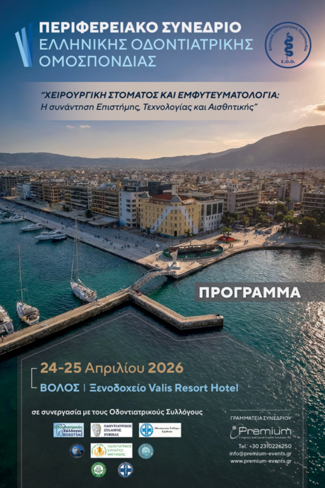 Το πρώτο Πανελλήνιο Περιφερειακό Συνέδριο της Ε.Ο.Ο. με θέμα: “ΧΕΙΡΟΥΡΓΙΚΗ ΣΤΟΜΑΤΟΣ ΚΑΙ ΕΜΦΥΤΕΥΜΑΤΟΛΟΓΙΑ – Η Συνάντηση Επιστήμης, Τεχνολογίας και Αισθητικής” θα διεξαχθεί στον Βόλο στις 24 & 25 Απριλίου 2026. Δείτε περισσότερες πληροφορίες στην ιστοσελίδα: https://www.eoo.gr/dental_events/1o-perifereiako-synedrio-e-o-o-o-s/ Λίγες ημέρες έμειναν για την έναρξη του 1ου Πανελλήνιου Περιφερειακού Συνεδρίου της Ε.Ο.Ο. και των Ο.Σ. στον όμορφο Βόλο! Δείτε το αναλυτικό πρόγραμμα πατώντας ΕΔΩ