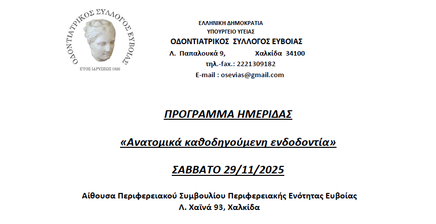 Ο σύλλογός μας θα πραγματοποιήσει επιστημονική ημερίδα με θέμα την «Ανατομικά καθοδηγούμενη ενδοδοντία», το Σάββατο 29 Νοεμβρίου 2025, στην αίθουσα Περιφερειακού Συμβουλίου Περιφερειακής Ενότητας Ευβοίας στην οδό Λ. Χαϊνά 93 στην Χαλκίδα.